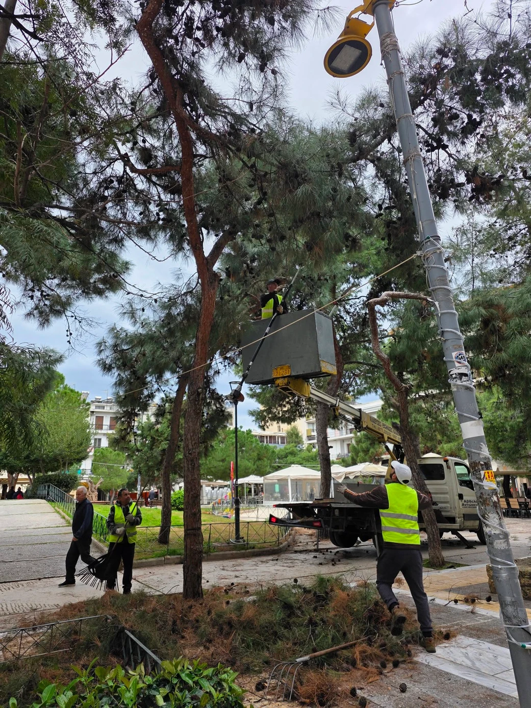 Στο πλαίσιο των εργασιών, εξειδικευμένα συνεργεία προχώρησαν σε καθαρισμό και κλάδεμα των δέντρων, ώστε να διατηρηθούν υγιή και ασφαλή.