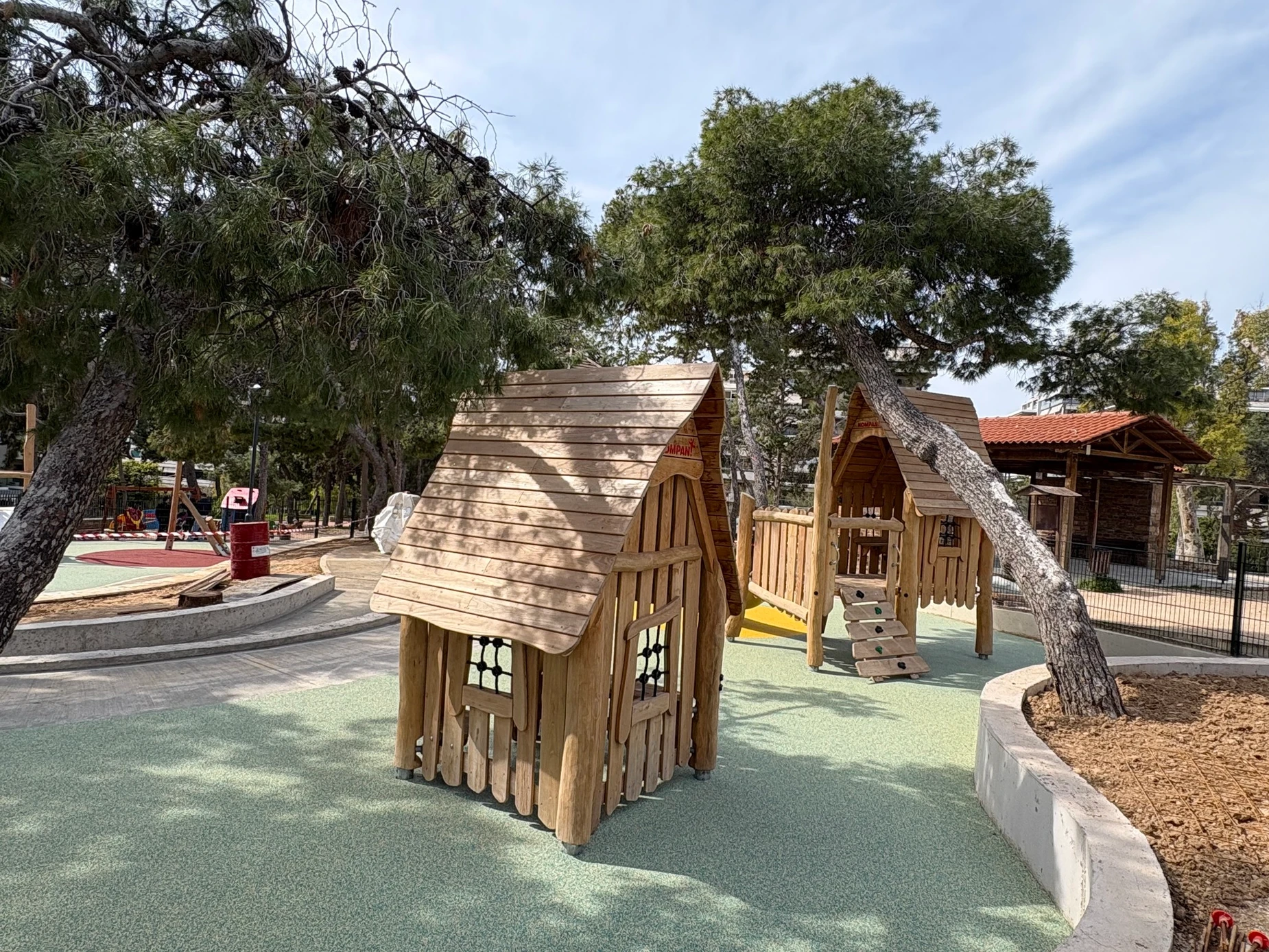 Ιδιαίτερη έμφαση έχει δοθεί στις επιφάνειες πτώσης, όπου χρησιμοποιήθηκαν χυτά δάπεδα από οικολογικά υλικά, τα οποία προσφέρουν αυξημένη προστασία και υψηλό επίπεδο υγιεινής για τα παιδιά.