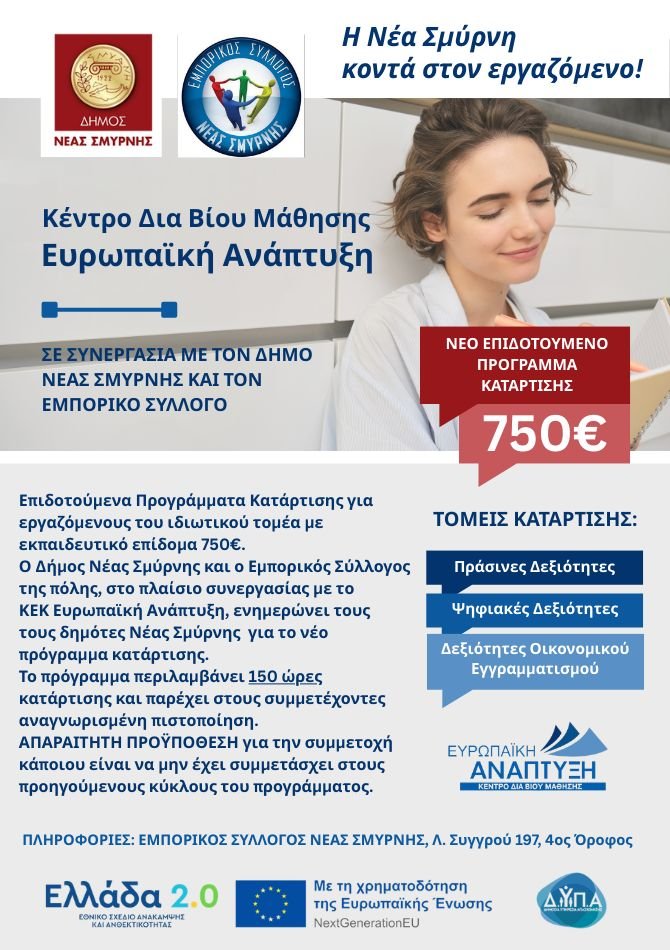 Επιδοτούμενα προγράμματα κατάρτισης για εργαζόμενους του ιδιωτικού τομέα και ανέργους, με εκπαιδευτικό επίδομα 750 ευρώ, υλοποιούνται στη Νέα Σμύρνη στο πλαίσιο Μνημονίου Συνεργασίας μεταξύ του Δήμου Νέας Σμύρνης, του Εμπορικού Συλλόγου της πόλης και του ΚΕΚ «ΕΥΡΩΠΑΪΚΗ ΑΝΑΠΤΥΞΗ».