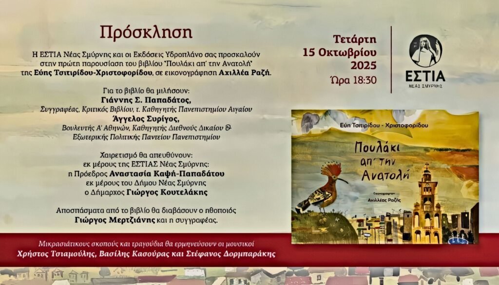 Η Εστία Νέας Σμύρνης, σε συνεργασία με τις Εκδόσεις Υδροπλάνο, παρουσιάζουν το νέο βιβλίο της συγγραφέως Εύης Τσιτιρίδου–Χριστοφορίδου με τίτλο «Πουλάκι απ’ την Ανατολή», σε εικονογράφηση του Αχιλλέα Ραζή. Η εκδήλωση θα πραγματοποιηθεί την Τετάρτη 15 Οκτωβρίου 2025, ώρα 18:30, στην αίθουσα της Εστίας.