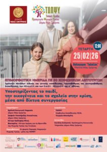 Η Τοπική Ομάδα Προαγωγής Ψυχικής Υγείας (ΤΟΠΨΥ) του Δήμου διοργανώνει ημερίδα με τίτλο «Υποστηρίζοντας το παιδί, την οικογένεια και το σχολείο στην κρίση, μέσα από δίκτυα συνεργασίας», η οποία θα πραγματοποιηθεί την Τετάρτη 25 Φεβρουαρίου, στις 12:00 το μεσημέρι, στον Δημοτικός Πολυχώρος «Γαλαξίας».